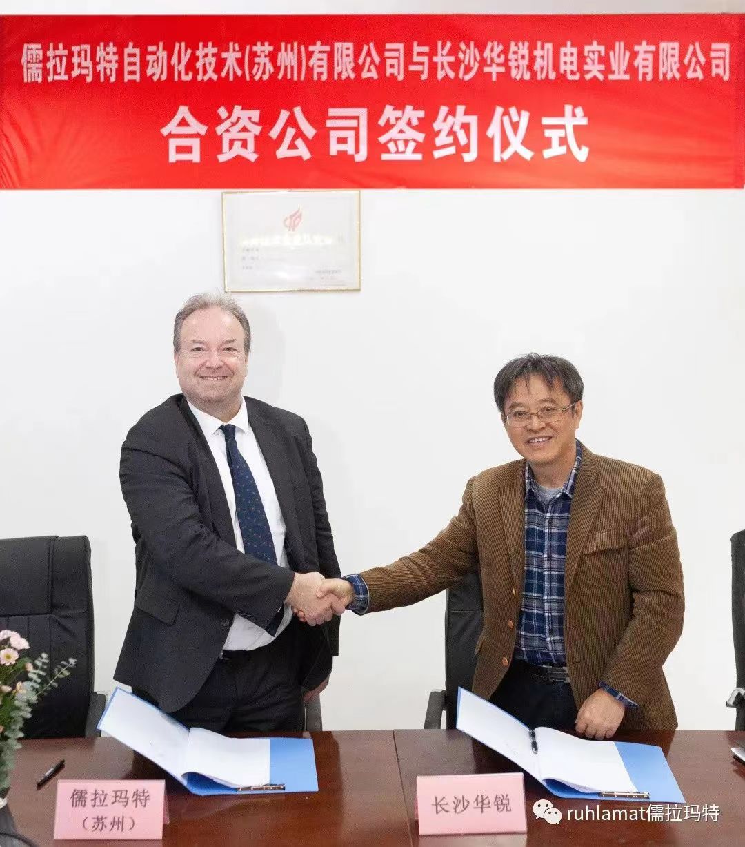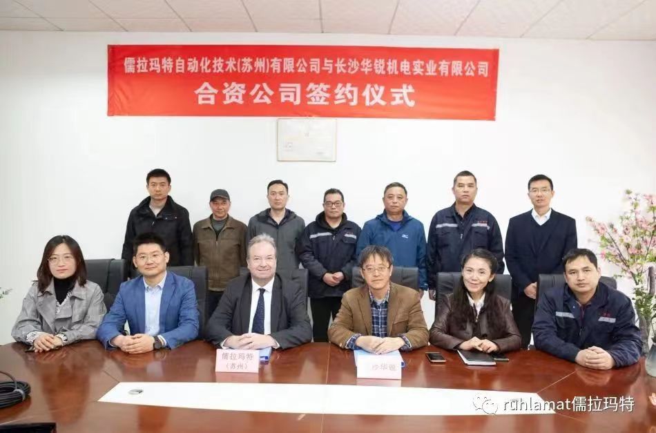 儒拉瑪特自動(dòng)化技術(shù)(蘇州)有限公司與長(zhǎng)沙華銳機(jī)電實(shí)業(yè)有限公司在長(zhǎng)沙舉辦了合資公司簽約儀式,儒拉瑪特(蘇州)董事總經(jīng)理白世泰先生與長(zhǎng)沙華銳總經(jīng)理王小明先生簽署合作協(xié)議。